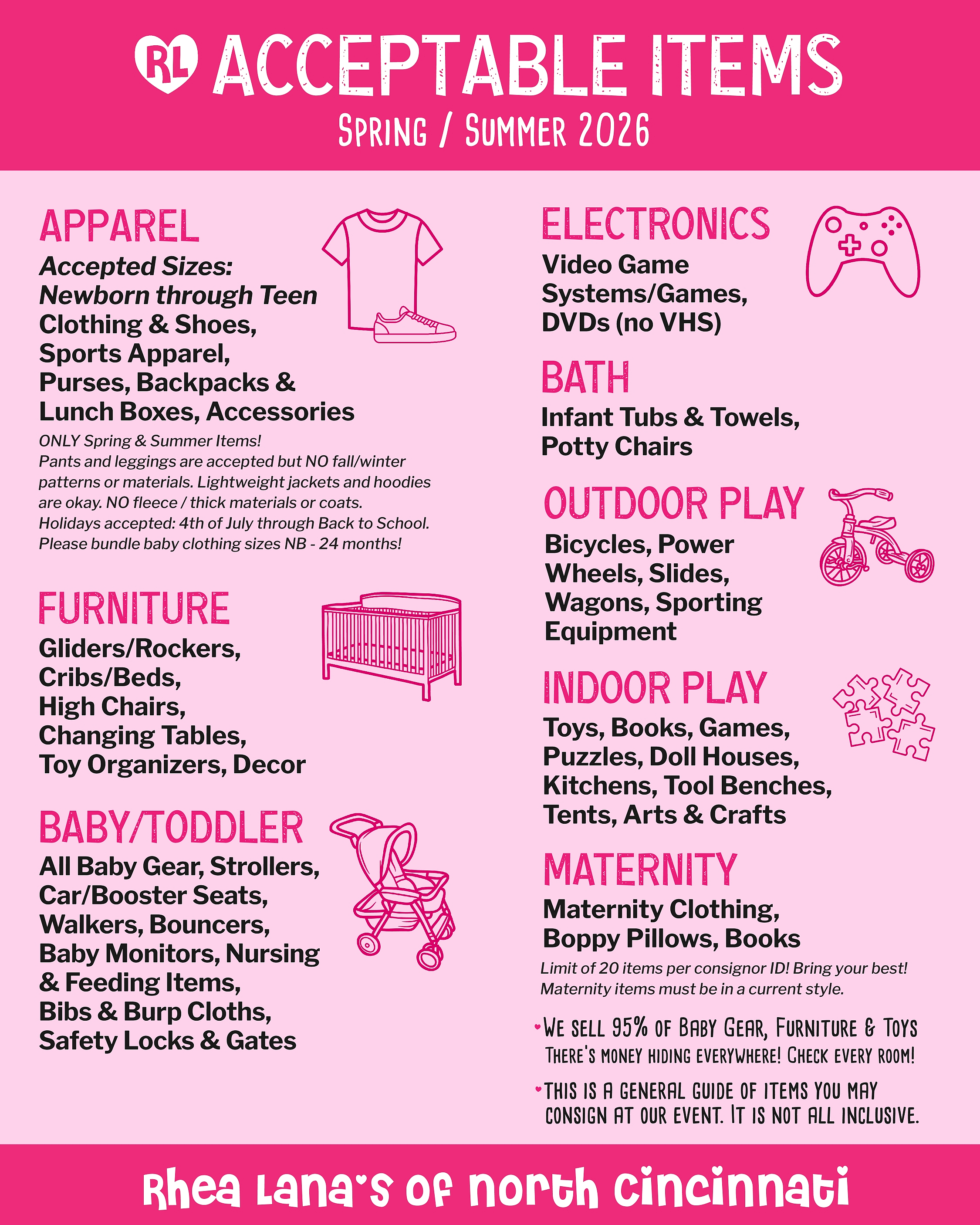 We will gladly accept the following items (in great condition): Spring/Summer clothing and shoes, toys, books, games, baby accessories, closed-system breast pumps, nursing accessories, bikes, strollers, wagons, pack-n-plays, cribs, toddler beds, children's furniture, gliders, outdoor toys, and so much more! Holidays accepted: 4th of July/Patriotic and Back to School.